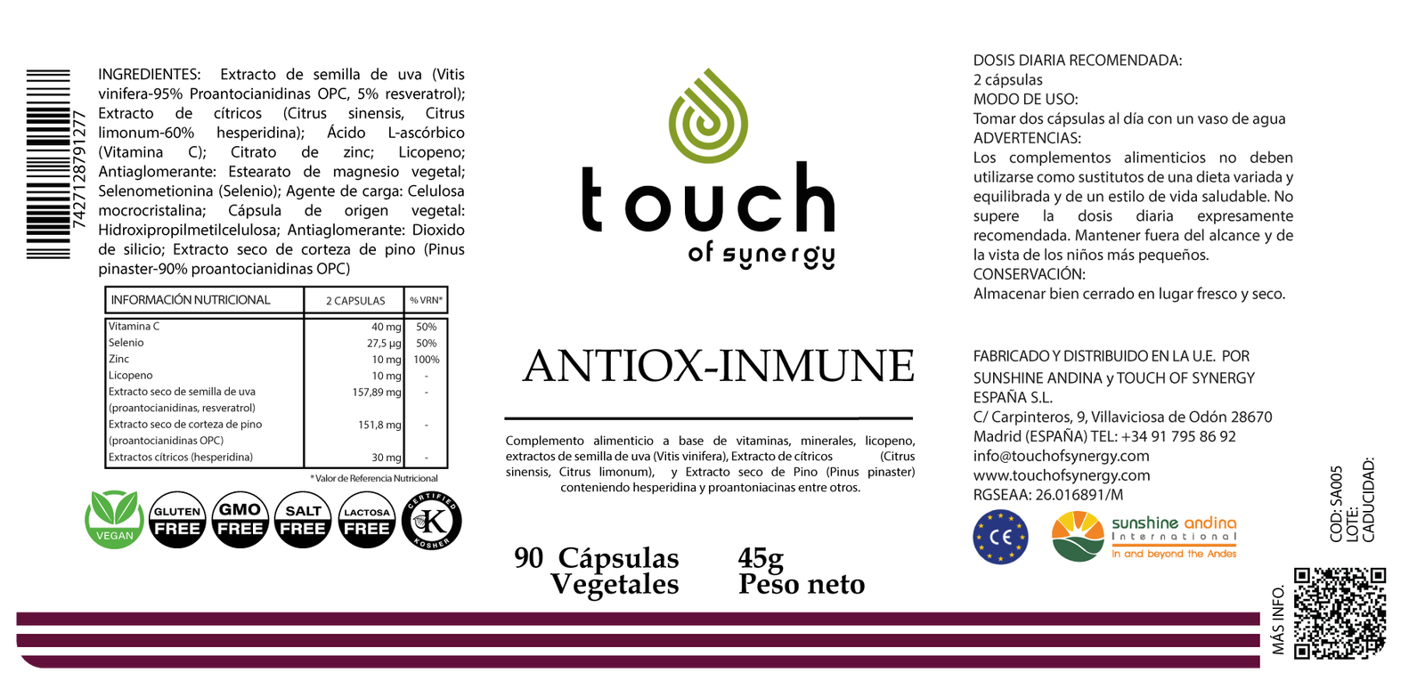 Antiox Inmune combina vitaminas, minerales y extractos naturales para ofrecer un apoyo integral a tu bienestar diario. Su fórmula está diseñada para reforzar las defensas, proteger las células frente a los radicales libres y favorecer la salud cardiovascular.