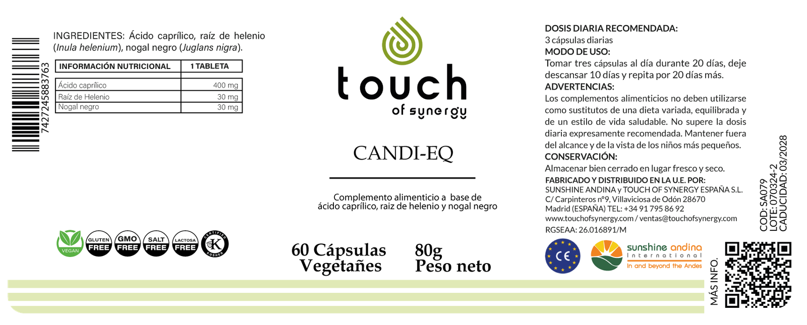 Ácido caprílico (400 mg): Atraviesa las membranas celulares y facilita la absorción de antioxidantes; actúa como potente antifúngico natural.