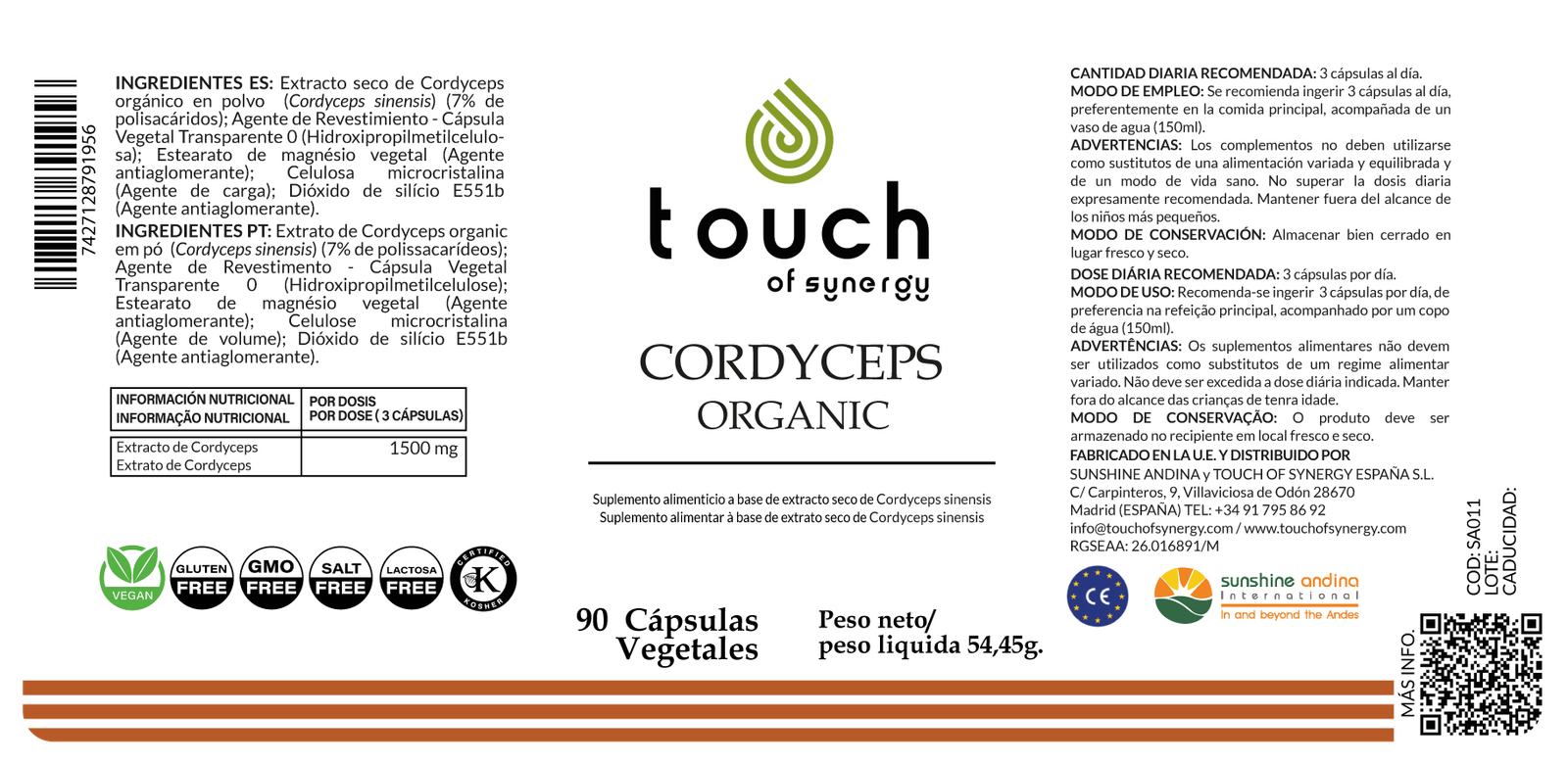 672 mg de hongo Cordyceps Sinensis por cápsula, recolectado manualmente o cultivado en sustratos naturales que replican sus propiedades originales.
