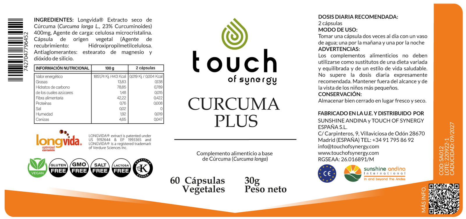 Versión alternativa: Cúrcuma longa estandarizada al 93% + 30 mg de pimienta negra