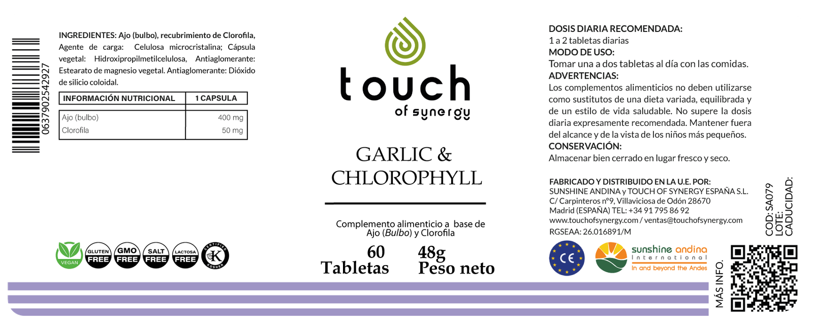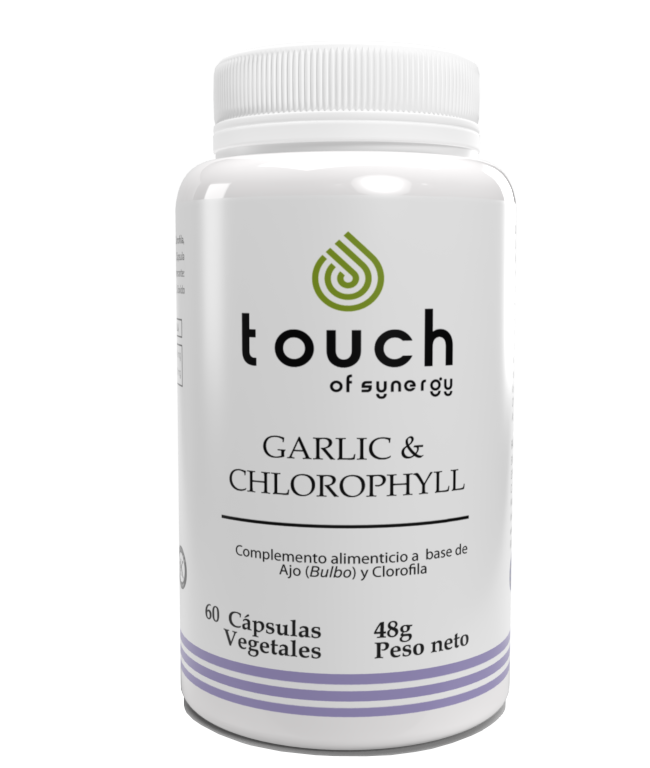 Garlic con Clorofila de Touch of Synergy es un suplemento completo que combina las propiedades antimicrobianas, antioxidantes y cardioprotectoras del ajo con la capacidad depurativa y neutralizadora del mal aliento de la clorofila, convirtiéndolo en un aliado diario para la salud integral.