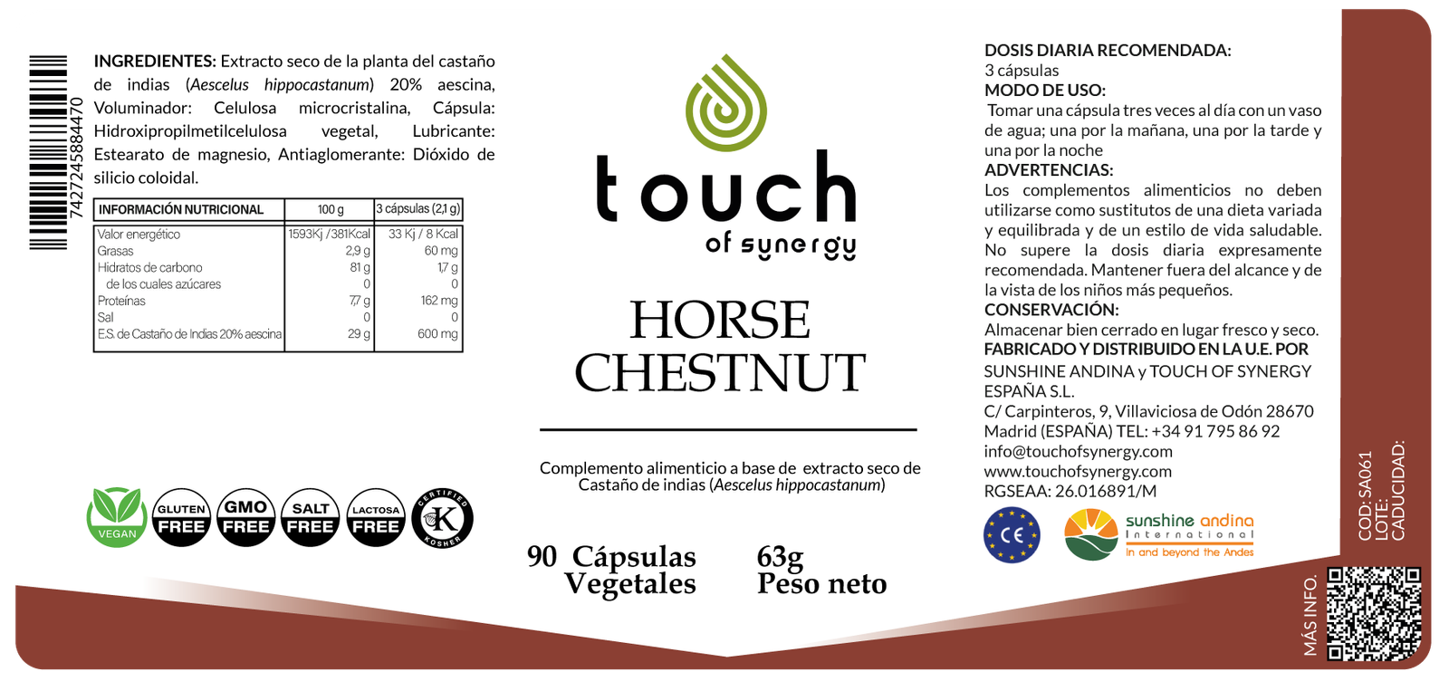 Horse Chestnut contiene extracto seco de Castaño de Indias (Aesculus hippocastanum), reconocido por sus efectos positivos en la circulación venosa. Sus componentes activos, aescina y aesculina, ayudan a mejorar el flujo sanguíneo, reducir la inflamación y fortalecer las paredes de los vasos sanguíneos, proporcionando alivio a quienes padecen insuficiencia venosa crónica y problemas relacionados.