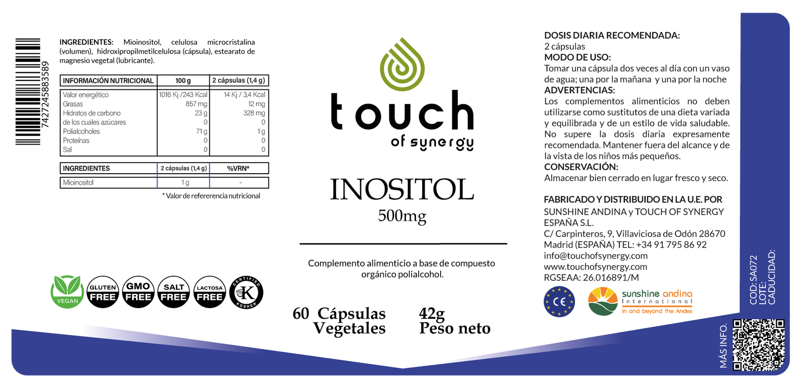 Mio-Inositol (compuesto orgánico polialcohol) – 500 mg por cápsula