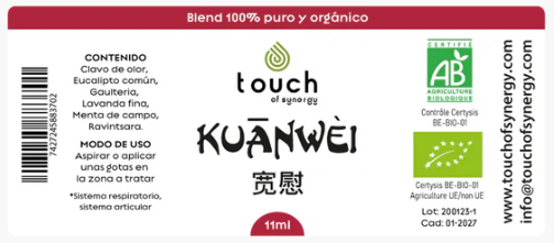 El Aceite esencial Kuanwei 11 ml es un blend cuidadosamente formulado con Ravintsara, Clavo de Olor, Eucaliptus globulus, Lavanda, Menta de campo y Gaulteria, diseñado para ofrecer alivio y bienestar integral. Sus propiedades naturales ayudan a descongestionar las vías respiratorias, disminuir inflamación y dolores articulares, aliviar tensiones musculares y mitigar el dolor de cabeza. Ideal para masajes, inhalaciones o compresas, Kuanwei se convierte en tu aliado diario para mantener cuerpo y mente en equilibrio, especialmente en momentos de esfuerzo físico o cansancio.