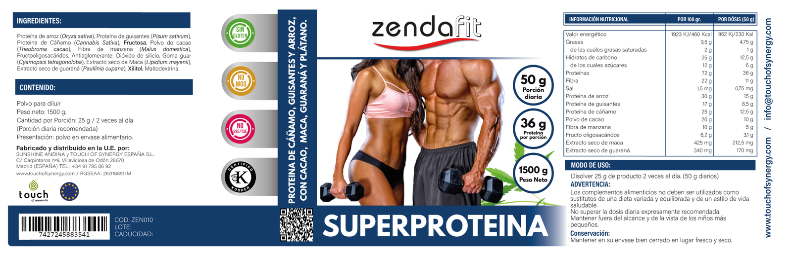 Proteína de arroz, proteína de guisantes, proteína de cáñamo, cacao puro, fibra de manzana, extractos secos de maca y guaraná, plátano, endulzante xylitol.