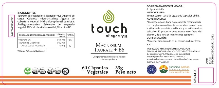 Taurato de Magnesio es una forma altamente absorbible de magnesio unida a taurina, combinada con vitamina B6, diseñada para apoyo muscular, nervioso y digestivo, y para aliviar molestias relacionadas con calambres y síndrome premenstrual.