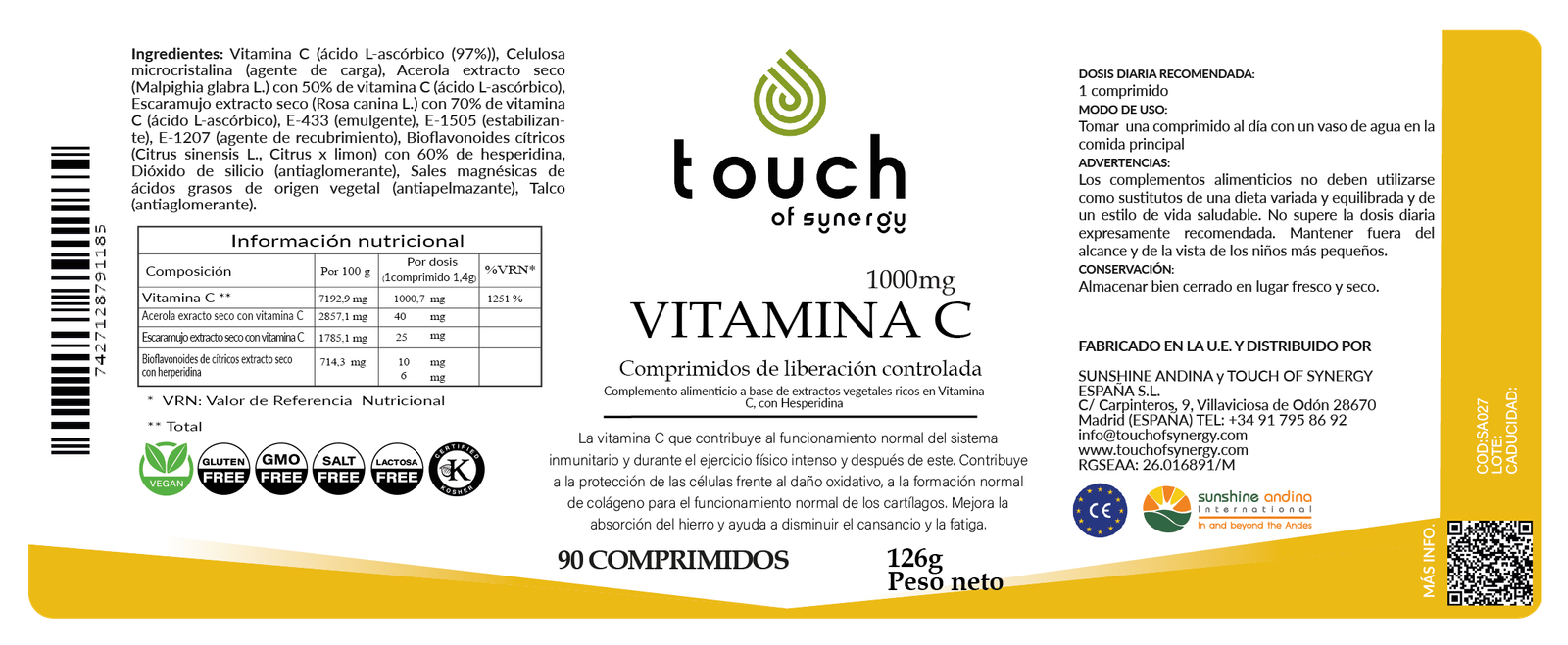 Vitamina C de liberación controlada, antioxidante y esencial para el sistema inmunológico. Favorece la producción de colágeno, mantiene huesos, dientes y cartílagos fuertes, ayuda a la cicatrización y a una circulación saludable. Ideal para veganos y sin gluten.